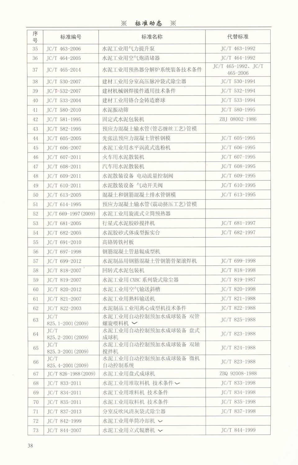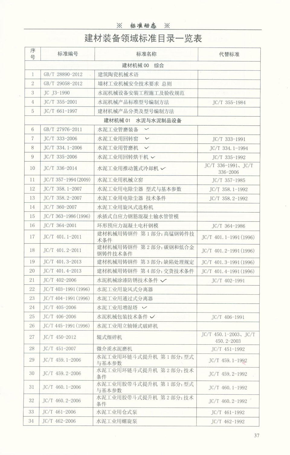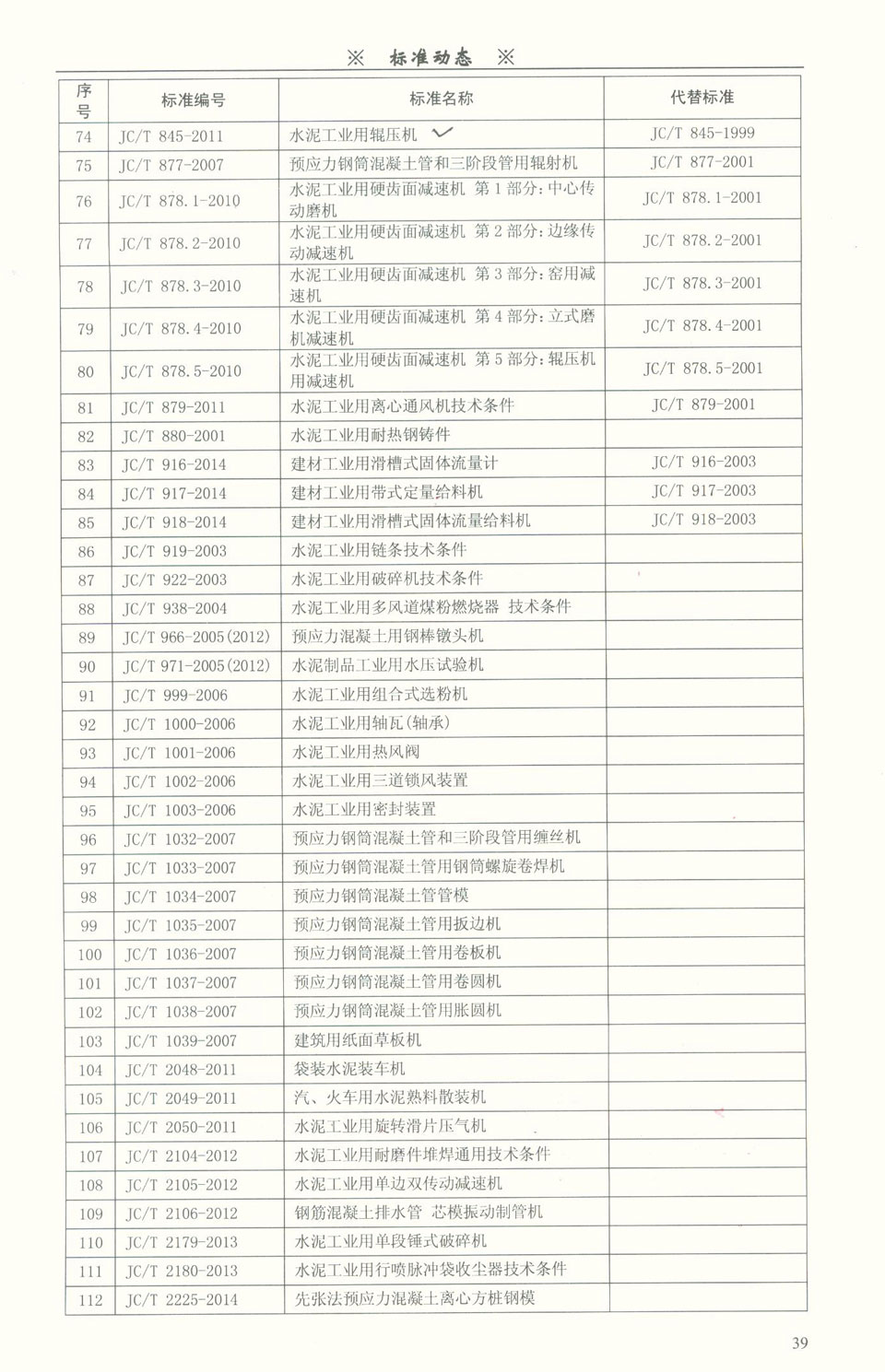 江苏开云手机站登录入口集团着眼于国内建材机械新技术、新产品、新工艺、新材料的技术领域,普及和提高标准化意识,强化新标准的宣贯工作,提高对标准化工作的感知、重视程度,全面提高行业各类标准的覆盖率,创造更加良好的标准化工作发展空间。公司在企业内部制定并实施了技术标准、管理标准和工作标准并有效组织推进实施,先后参与国家建材机械标准化技术委员会组织的GB/T27976-2011水泥工业管磨装备、JC/T 333-2006 水泥工业用回转窑、JC/T 334.1-2006水泥工业用管磨机、JC/T335-2006 水泥工业用回转烘干机、JC/T 336-2014 水泥工业用推动篦式冷却机、JC/T 402-2006 水泥机械涂漆防锈技术条件、JC/T 825.1-2001(2009) 水泥工业用自动控制预加水成球装备 双管螺旋喂料机、 JC/T 833-2011 水泥工业用堆取料机 技术条件 JC/T 842-1999 水泥工业用单筒冷却机、JC/T 844-2007 水泥工业用立式辊磨机、JC/T845-2011水泥工业用辊压机、JC/T401-2011建材机械用铸钢件技术条件、JC/T999-2006水泥工业用组合式选粉机、JC/T406-2006水泥机械包装技术条件、JC/T405-2006水泥工业用增湿塔等15项产品标准起草工作.