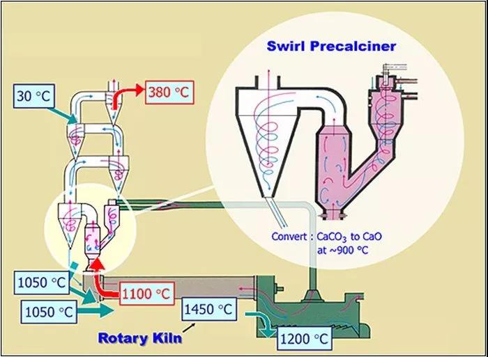 • 生料粉在旋风预热器系统中与高温热气在悬浮状态下进行热交换。