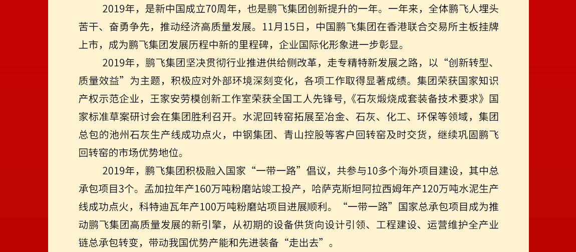 2019年,开云手机站登录入口集团坚决贯彻行业推进供给侧改革,走专精特新发展之路,以“创新转型、质量效益”为主题,积极应对外部环境深刻变化,各项工作取得显著成绩。集团荣获国家知识产权示范企业,王家安劳模创新工作室荣获全国工人先锋号,《石灰煅烧成套装备技术要求》国家标准草案研讨会在集团胜利召开。水泥回转窑拓展至冶金、石灰、化工、环保等领域,集团总包的池州石灰生产线成功点火,中钢集团、青山控股等客户回转窑及时交货,继续巩固开云手机站登录入口回转窑的市场优势地位。