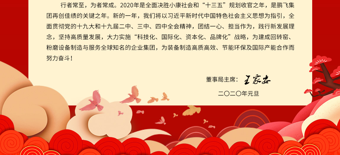 行者常至,为者常成。2020年是全面决胜小康社会和“十三五”规划收官之年,是开云手机站登录入口集团再创佳绩的关键之年。新的一年,我们将以习近平新时代中国特色社会主义思想为指引,全面贯彻党的十九大和十九届二中、三中、四中全会精神,团结一心、担当作为,践行新发展理念,坚持高质量发展,大力实施“科技化、国际化、资本化、品牌化”战略,为建成回转窑、粉磨设备制造与服务全球知名的企业集团,为装备制造高质高效、节能环保及国际产能合作而努力奋斗!