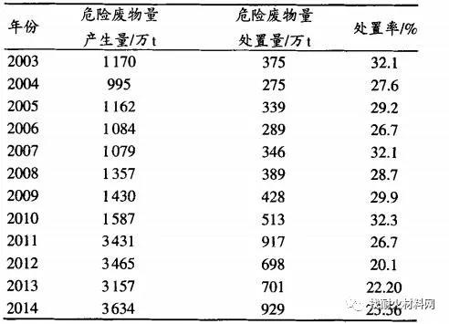 根据2015年《全国环境统计公报》,2014年我国工业危废产生量3634万t,山东、湖南、四川、浙江、江苏、上海等地产生量最大,2003~2014年中国工业危险废物处置情况见表1。从处置情况来看,综合利用量2062万t,无害化处置量929万t,综合利用率为56%,无害化处置率仅为25%,大量危废得不到安全、有效的处置。这些危险废弃物具有腐蚀性、可燃性和浸出毒性,会严重污染大气、水源和土壤。现有的处置方式及能力已不堪重负,寻求一条新的出路迫在眉睫。