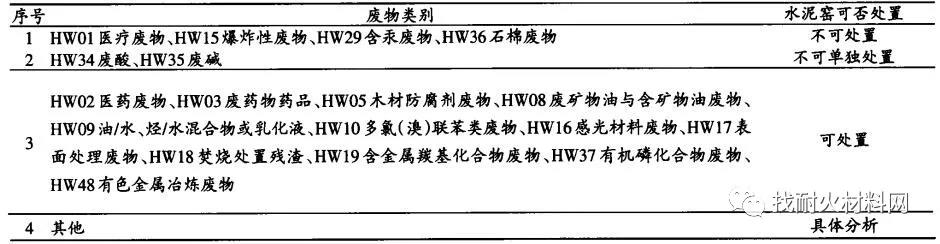 危险废弃物种类繁多,成分复杂,存在多种形态,在利用水泥窑进行处置时必须遵守两个基本准则,其一:处置要绝对安全可靠,不能带来新的环境污染或污染转移;其二:不能影响水泥熟料正常的生产质量。大量实验研究及工业化试生产实践证实,水泥窑可以处置的类别有:废酸、废碱、有机溶剂废物、乳化液、固体危险废物、医药废物、废药物药品、精馏残渣、废矿物油等,约占《国家危险废物名录》总数的50%左右。各类危废是否可采用水泥窑处置的具体分类见表2。