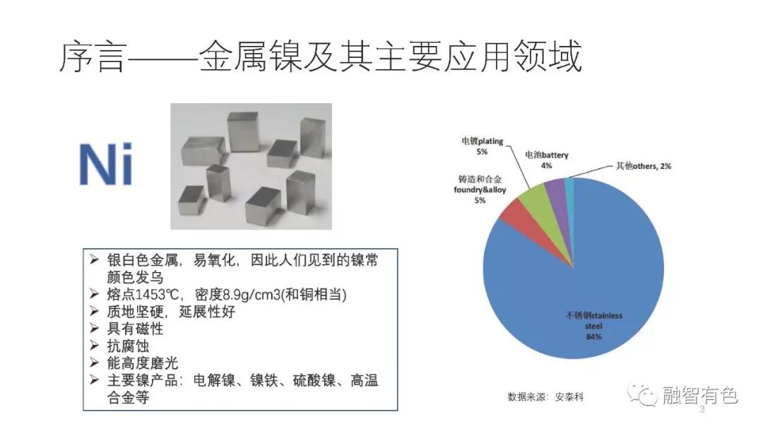 按:金属镍是一种性质优异的基础金属,在不锈钢、电镀、铸造及合金、动力电池等领域广泛。特别是近年来由于新能源汽车长续航里程的要求,使得高镍三元动力电池受到大家的极力热捧,由此又带动了镍在新能源领域的高速增长,为镍的应用再次锦上添花。