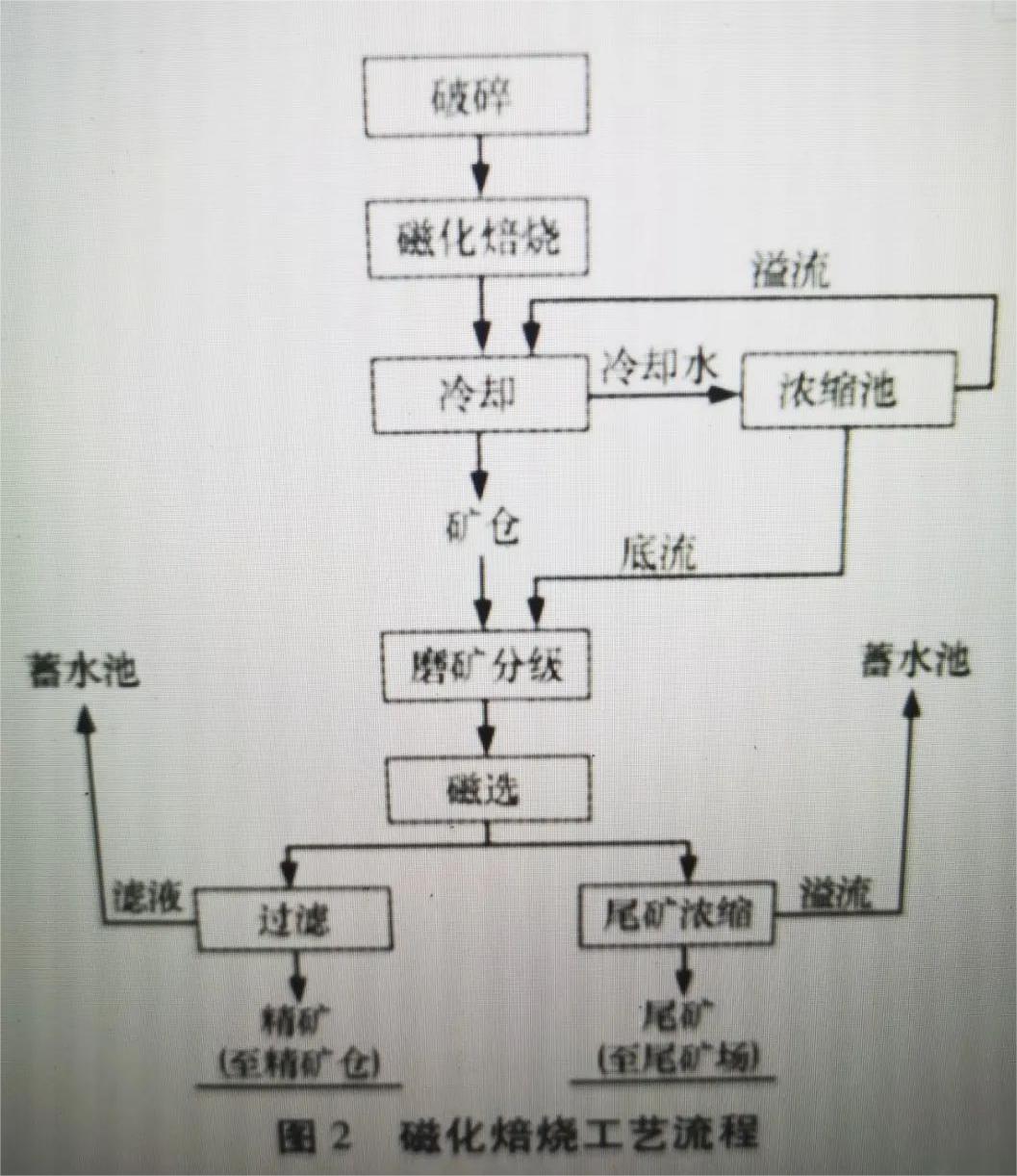 炙热的菱铁矿如果接触氧气很容易转化为r-Fe2O3 ,甚至弱性的a-Fe2O3 ,导致弱磁选困难,为了防止焙烧矿在出窑时弱磁性赤铁矿,故焙烧矿出窑方案设计为水封拉链水冷,出水温度一般为70°C 左右。然后进料仓,再经过磨碎分级进行磁选,选出精矿粉。