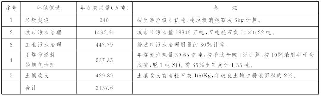 “十四五”期间,我国将全面开展大气、水、土壤和新型污染物的治理,推进生态保护修复,实现减污增容。绿色发展和美丽中国建设将把环保产业推上新的风口。发达国家环保和农业用石灰占比达20%以上,而中国环保及农业用石灰的占比不足10%。石灰作为性价比高、无二次污染的高活性碱剂,在废气、废水、固废处理、土壤改良等领域得到广泛应用,已成为中国石灰工业的一个重要经济增长点。十四五期间,环保及农业用灰将会形成年需求3000万吨以上的增量市场。部分环保领域石灰消耗量估算见表5。