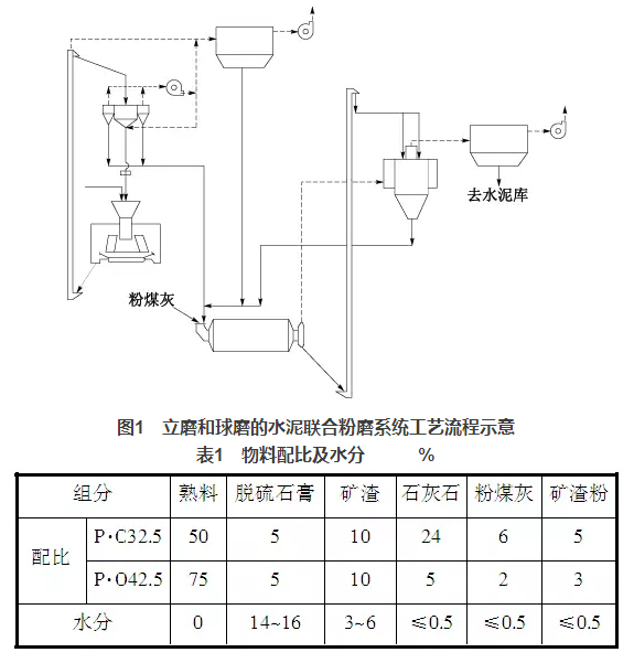 涞水冀东水泥有限公司3个水泥粉磨系统均采用JLMS-24.3立磨与Φ4.8m×9.5m球磨机组成联合粉磨系统。JLMS-24.3立磨装机功率2240kW,磨盘中径2400mm,3个磨辊,磨盘转速33.58r/min,产量210t/h,入料粒度≤30mm;配套选粉机JXF4100GY,成品量180~220t/h,比表面积≥200m2/kg,最大喂料量600t/h,通过气体温度≤150℃,通风量(70~90℃)180000m3/h;球磨机Φ4.8m×9.5m,装机功率3550kW,产量180t/h,生产P·O42.5水泥时,比表面积360~380 m2/kg;配套O-Sepa选粉机,通风量240000m3/h,最大通过量720t/h。水泥粉磨系统工艺流程见图1,系统设计指标:生产P·O42.5水泥,台时产量180t/h,分步电耗35.5kWh/t,比表面积360m2/kg,生产P·C32.5水泥,台时产量240t/h,分步电耗26.6kWh/t,比表面积370m2/kg。物料配比及相应的水分情况见表1。