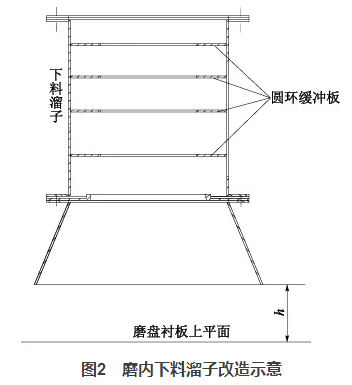 一方面它降低了入磨物料高落差对溜子的冲刷,另一方面圆环的收口作用使得物料的下料点发生了变化,将原先的单点偏心下料改成接近中心下料,改善了物料在磨盘上的偏离现象。同时,适当调整h值的大小(原设计600mm,最终改为400mm),使得下料波动时,可以起到一定的缓冲作用,稳定料床。
