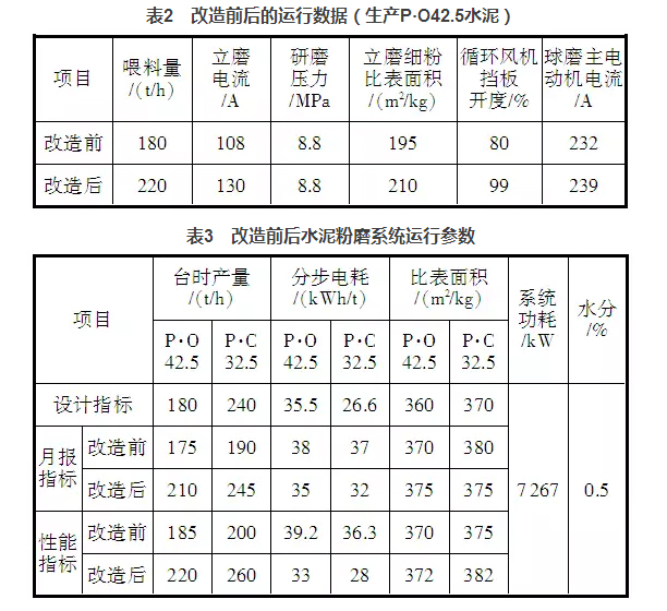 通过以上几个方面的整改,水泥粉磨系统的台时产量有了明显提升,表2是改造前后的运行数据,表3是水泥粉磨系统改造前后操作参数对照。