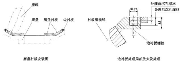 拆除边衬板螺栓,用磁力钻平钻头将Φ57沉孔钻深,深度由25mm加深到55mm,螺栓长度由M100缩短到M70(见图3)。这样处理后,磨辊及物料摩擦不到边衬板固定螺栓,生产得以维持正常进行。此方法也可用于新边衬板安装时。