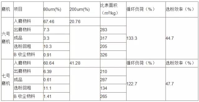 2、同时对六七号磨机的入磨物料、出磨物料、选粉机回粗、B收尘的物料、水泥成品、在磨机运转正常的情况下进行取样,做80um、200um、及比表面积以计算磨机的循环负荷和选粉机的选粉效率。测量结果见下表: