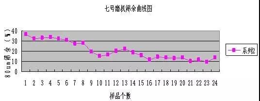 鉴于六七号磨机的状况,我们对两台磨机停磨进磨观察,六号磨机内两仓料球比过高,进磨后看不到钢球,物料高出一个钢球的高度,正常情况下钢球应该高出料面露出半个钢球为最佳,随现场测量计算六号磨一仓填充率为28.7%二仓为29.0%;七号磨机进磨观察一仓钢球露出料面一半,说明填充率应该是可以的,测量计算一仓的填充率为31.2%二仓为29.2%;这种磨机的最佳填充率一仓为30%左右二仓为31%左右。随取七号磨样做了磨机的筛余曲线,磨机均采用急停的停磨方式,入磨共取样品24个做80um和200um的筛余。见图1。