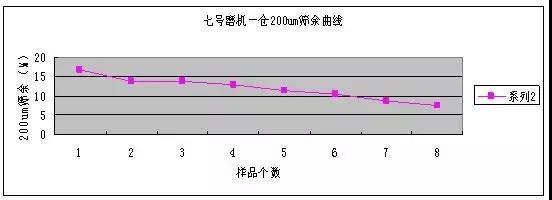 (1)从以上的两个趋势图可以看出七号磨机的一仓粉磨能力还可以,特别是200um的筛余趋势图,筛余下降明显。说明一仓钢球级配和理粉磨能力正常。