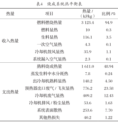 水泥窑系统热平衡范围主要包括烧成和冷却机系统,对该企业水泥窑系统的热平衡进行测试,系统热量收支平衡如表4所示。