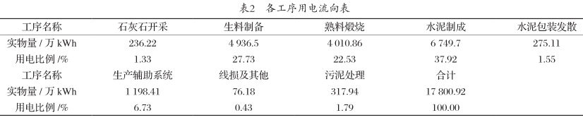 水泥企业电力消耗主要是设备动力拖动,一部分由社会电网提供,另外一部分由企业余热发电厂提供。2018年企业外购电力13 688.15 万kWh,余热自发电4 112.77 万kWh,合计17 800.92 万kWh全部用于水泥生产。各工序用电流向如表2所示。